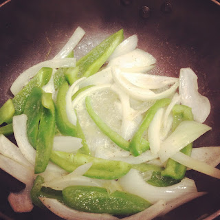 Sautee some pepper and onions. I used "I cant believe its not butter" (there is $1.25 coupon on coupons.com fyi) and Natures Own (obsessed much?)